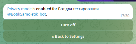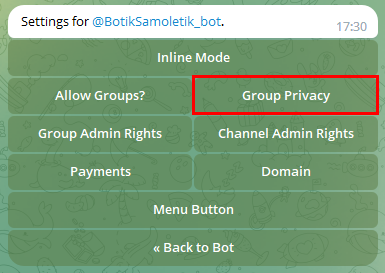 Дополнительно, если вы используете бота в группе, то рекомендуем здесь же в botfather зайти в настройки вашего бота "Bot Setting"