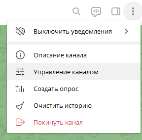1. Откройте меню в правом верхнем углу и нажмите "Управление каналом"<br>