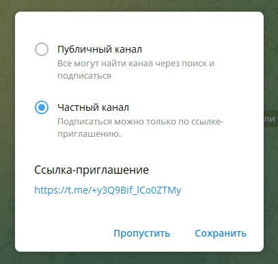 4. Телеграм предложит вам сразу пригласить кого-нибудь в канал. Мы рекомендуем сразу пригласить туда вашего бота. Если не нужно никого приглашать, просто нажмите "Пропустить".