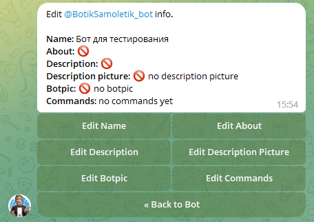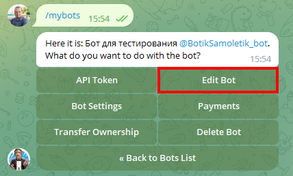 1. Проходим все шаги [в предыдущем пункте](#kak-ustanovit-avatar-i-opisanie-telegram-botu).
