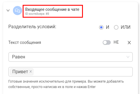 Для того, чтобы была реакция в чате, то в блоке Событие контейнер должен быть не "Входящее сообщение", а "Входящее сообщение в чате"